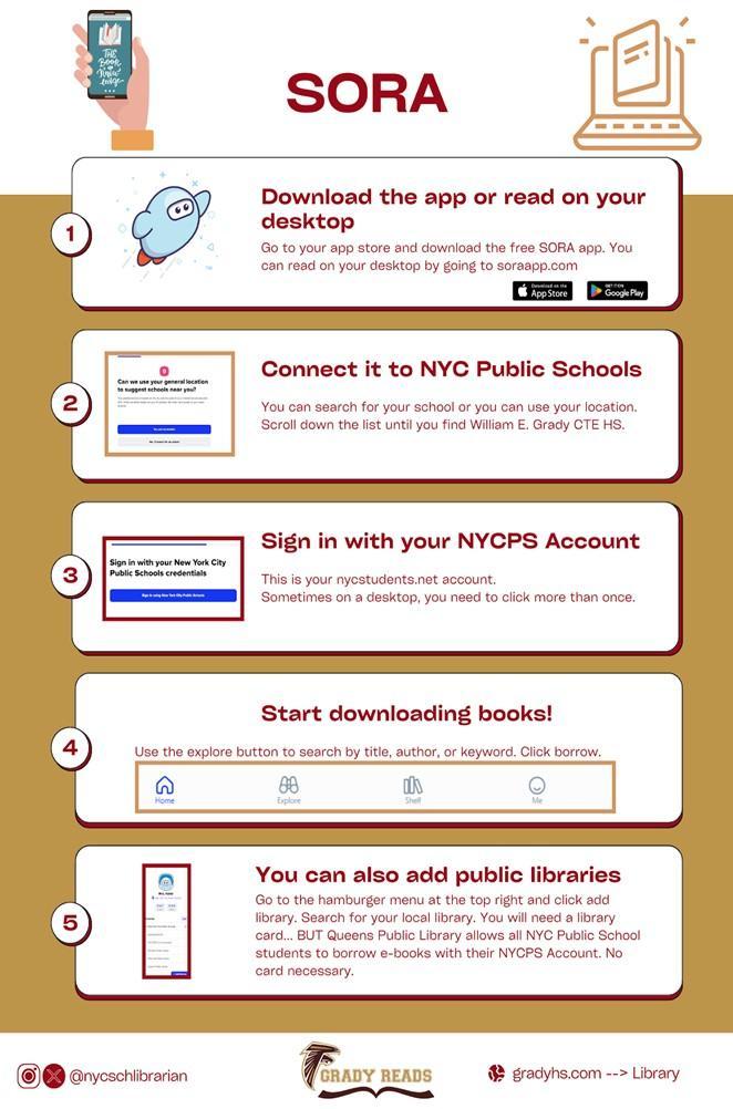 Download the app or read on your desktop. Go to your app store and download the free SORA app. You can read on your desktop by going to soraapp.com. If you have a Kindle you can use SORA there as well.